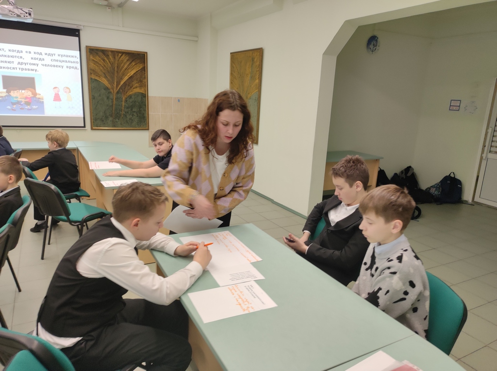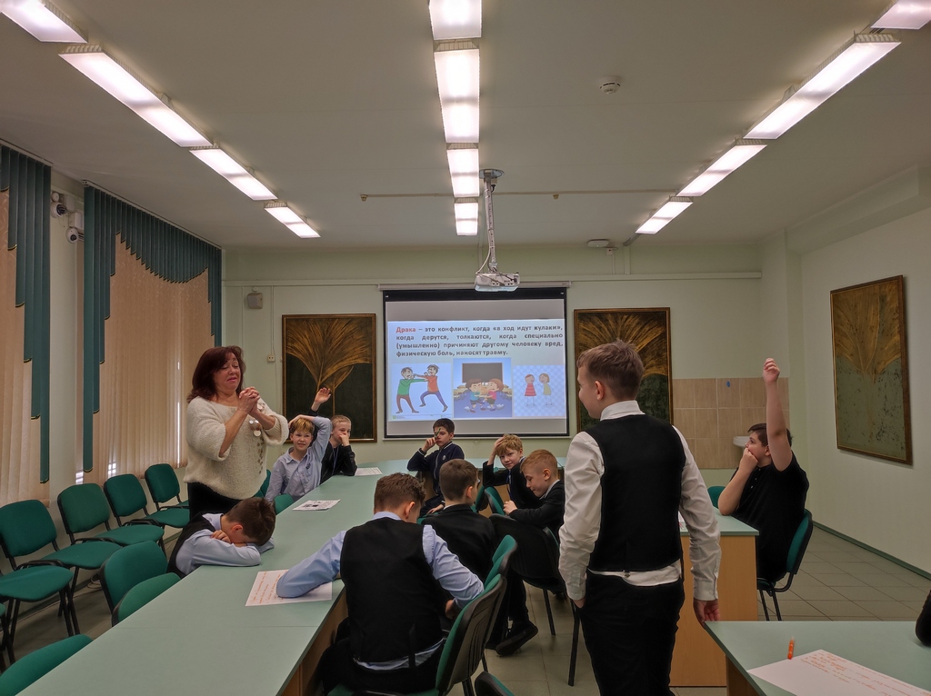 Педагоги обсудили с ребятами тему взаимодействия в школьном коллективе, разобрали кейсы конфликтных ситуаций: случайная ссора во время игры, спор между близкими друзьями, драка с одноклассниками. Все участники круглого стола активно отвечали на вопросы педагогов, дружно решали кейсы и с большим интересом работали в командах.