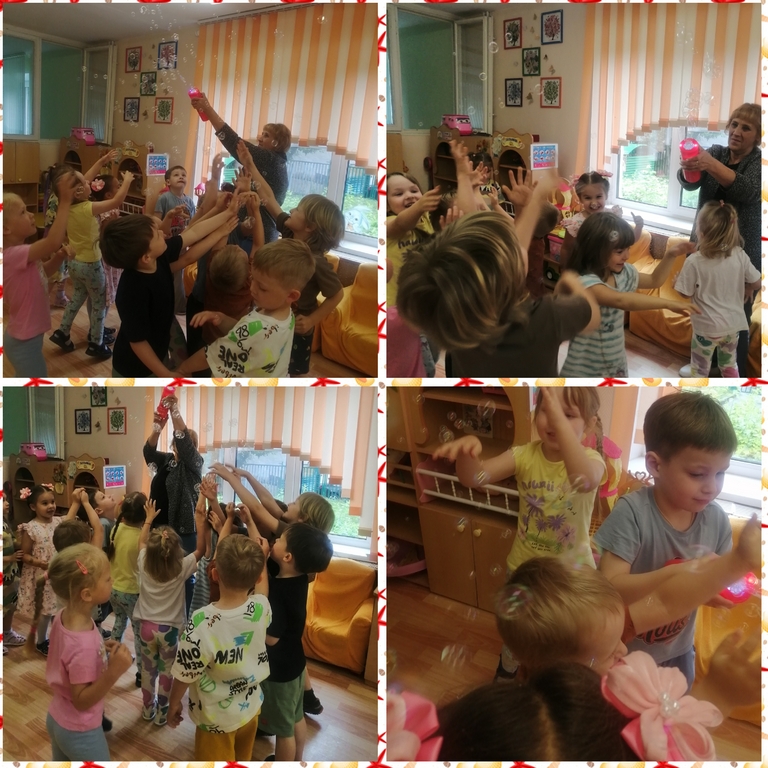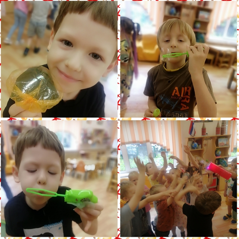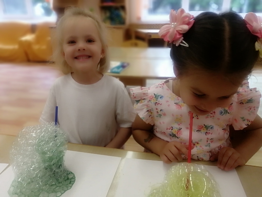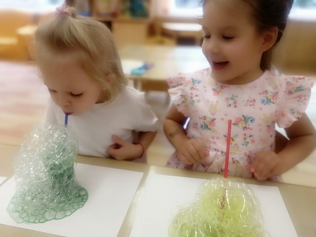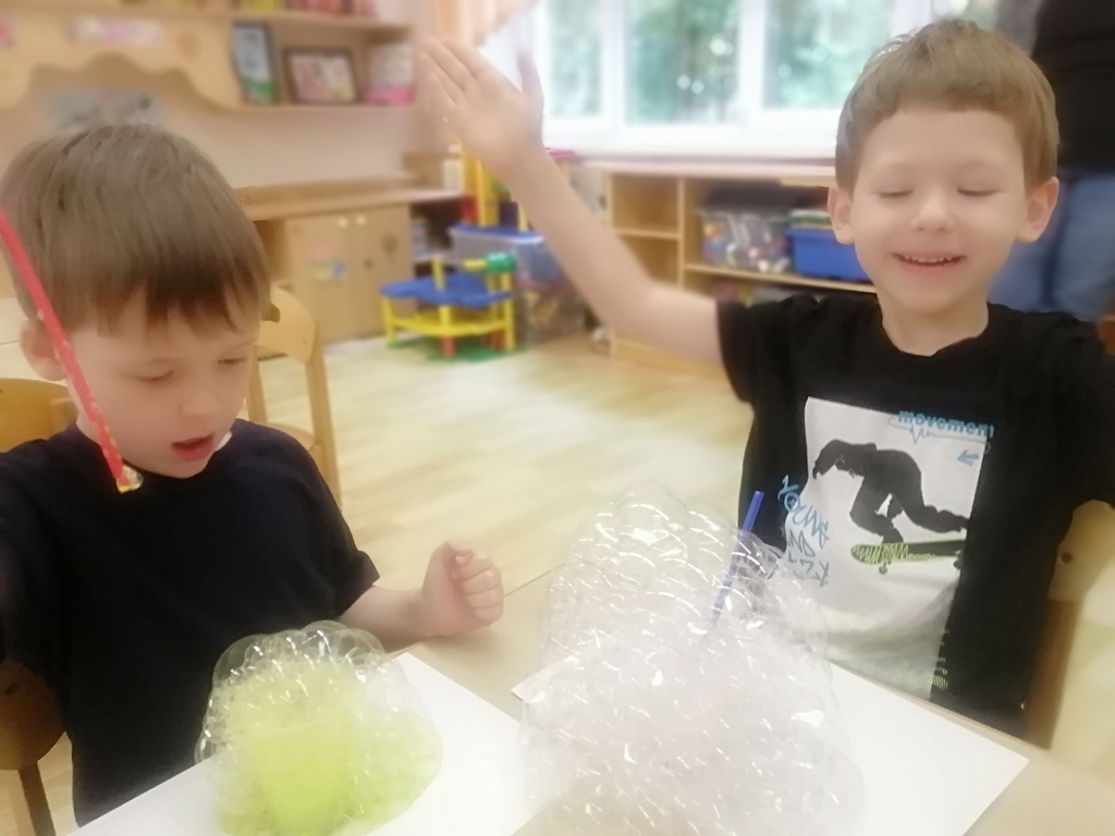 При помощи соломинок разного размера выдували воздушные пузыри - большие и маленькие, круглые и овальные. Дети с восторгом наблюдали, как мыльные пузыри переливаются и играют всеми цветами радуги. Праздник мыльных пузырей принес детям море радости, света, счастья и произвел на детей незабываемое впечатление. Дети получили массу положительных эмоций и зарядились хорошим настроением на целый день.