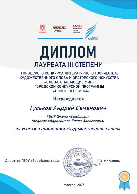 Подведены итоги городского конкурса литературного творчества, художественного слова и ораторского искусства "Слова спасающие мир" городской конкурсной программы "Новые вершины"