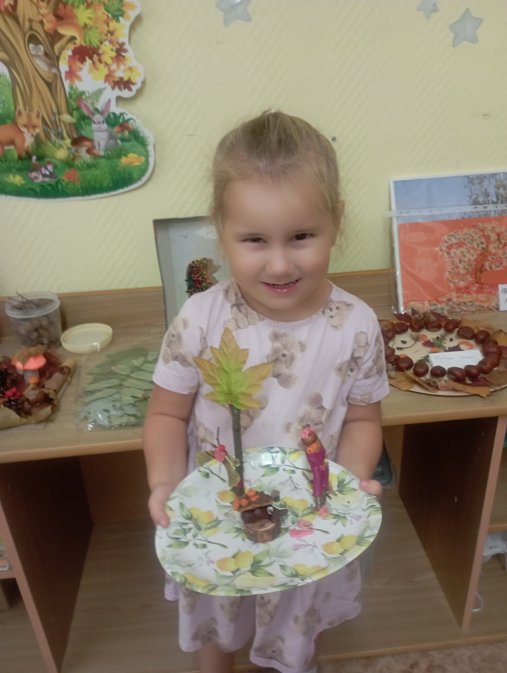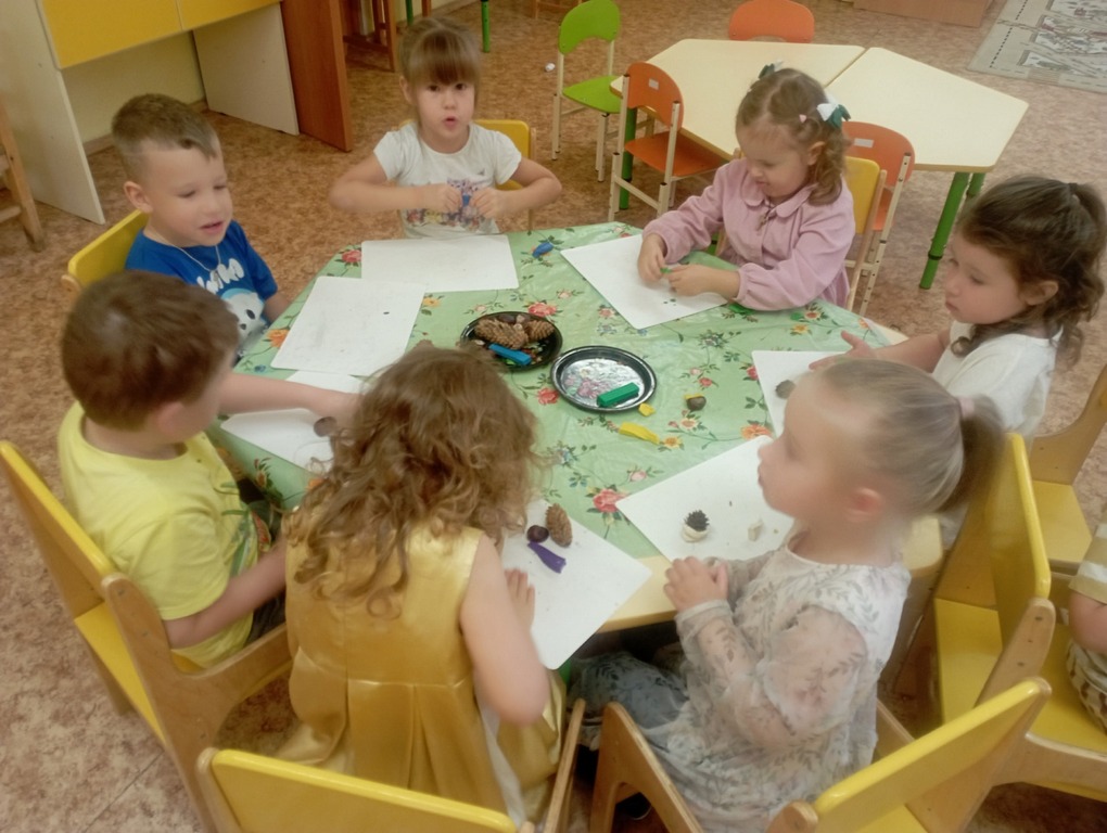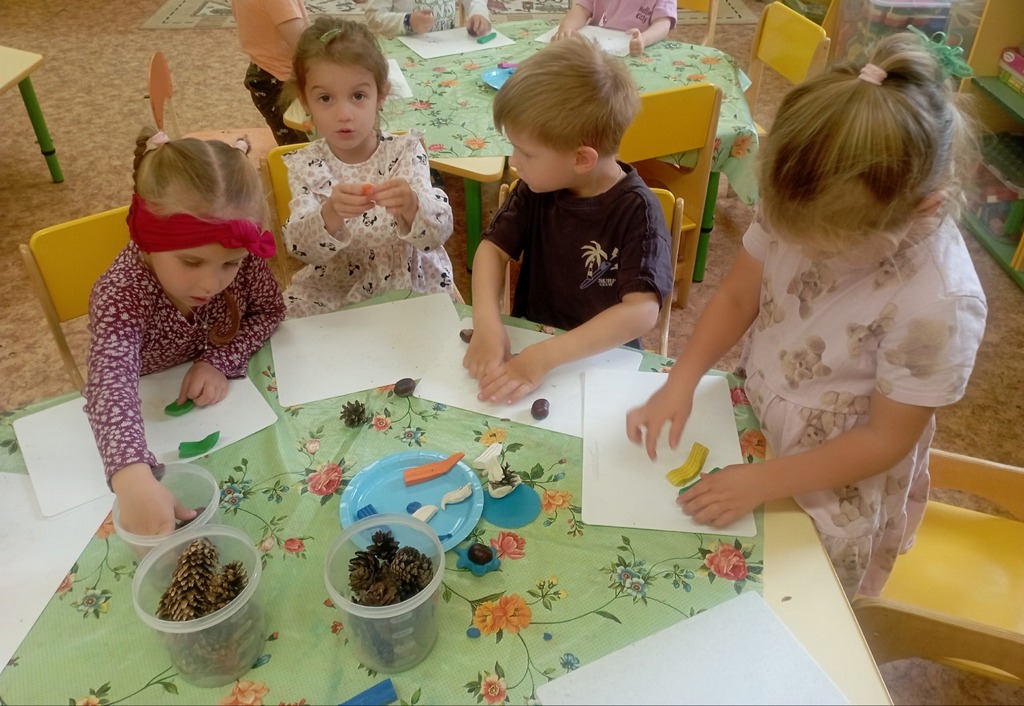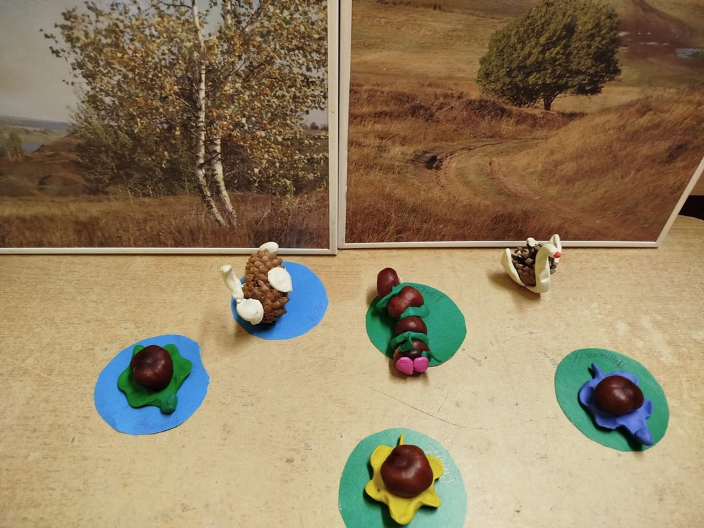 На творческих занятиях дети, став настоящими волшебниками, превращали с помощью пластилина шишки в прекрасных лебедей, а каштаны в весëлых черепашек.