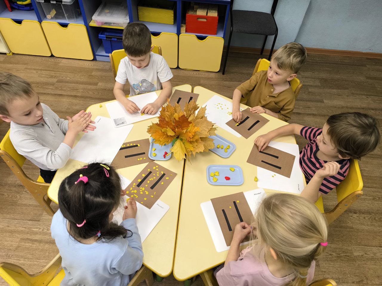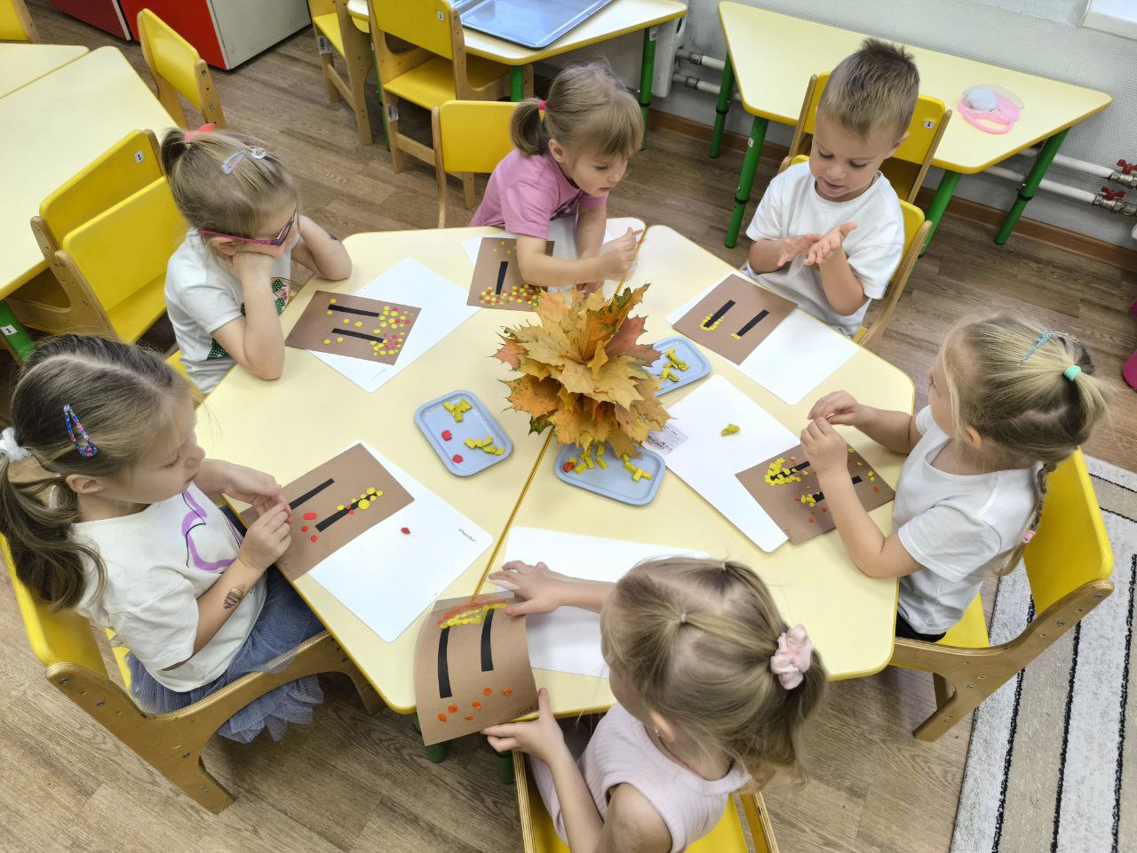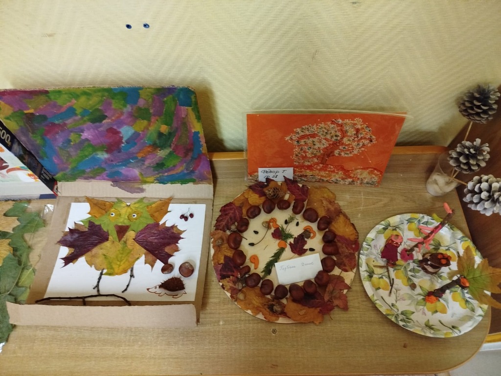 На познавательных занятиях дети обогатили свои представления о природном материале(шишки, жëлуди, засушенные осенние листья, каштаны, семена клëна и т. д.)