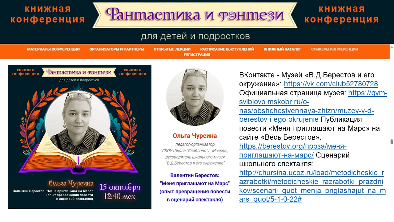 15 октября 2025 года руководитель школьного музея «В.Д.Берестов и его окружение» Чурсина Ольга Сергеевна представляет доклад на тему «В.Д.Берестов : «Меня приглашают на Марс» (опыт превращения повести в спектакль).