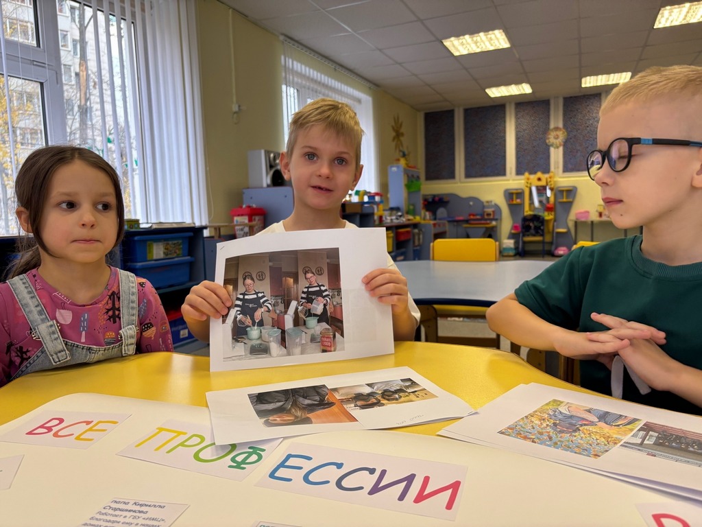Ребята с гордостью показывали друг другу фотографии своих мам и пап, делились рассказами о работе своих родителей и задавали вопросы. А после мы оформили красочный коллаж, посвященный профессиям родителей нашей группы. Также ребята играли в дидактические игры «Кто что делает?», «Чей инструмент?», отгадывали загадки и в сюжетно-ролевых играх примеряли на себя роли некоторых профессий, о которых узнали, например: врач, кондитер, грумер.